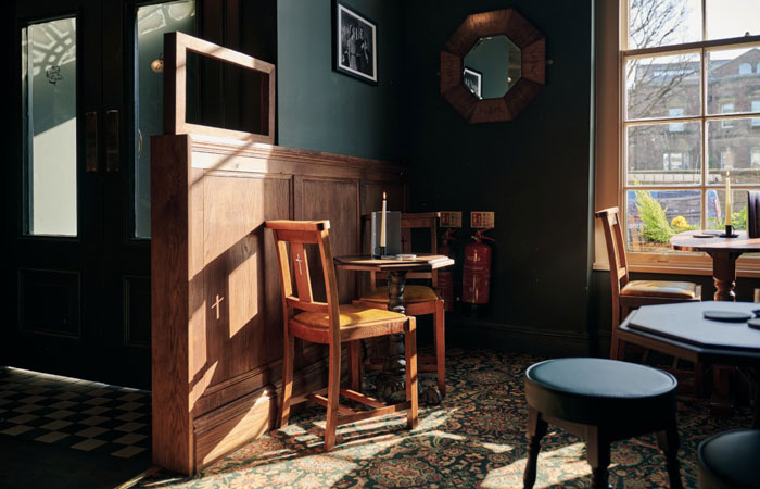 - A beautiful rustic oak pew, offering warmth, comfort, and a nod to ecclesiastical influences found in many classic British pubs.