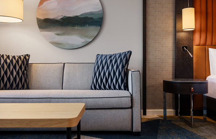 The guest rooms went through a soft refurbishment including updating the colour palette with changes to all the soft furnishings, lighting and carpeting. The overall layout remained unchanged other than adapting the rooms to include additional opportunities for seating either by way of a new sofa bed or chaise longue.