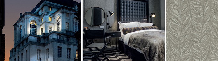 Zoffany, Ebru Town and Country wallpaper design was specially printed on a vinyl base for the 60 guestrooms, providing authentic design in the contract specifi cation needed for this historic project. Sanderson feather cushions and FROne curtains complete the look. Style Library Contracts, Carolyn Mitchell is delighted with the end result, “Gotham is a great example of Style Library Contract delivering luxurious design and uncompromising performance. We can manufacturer to individual client specifi cations whilst maintaining design integrity”.