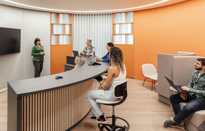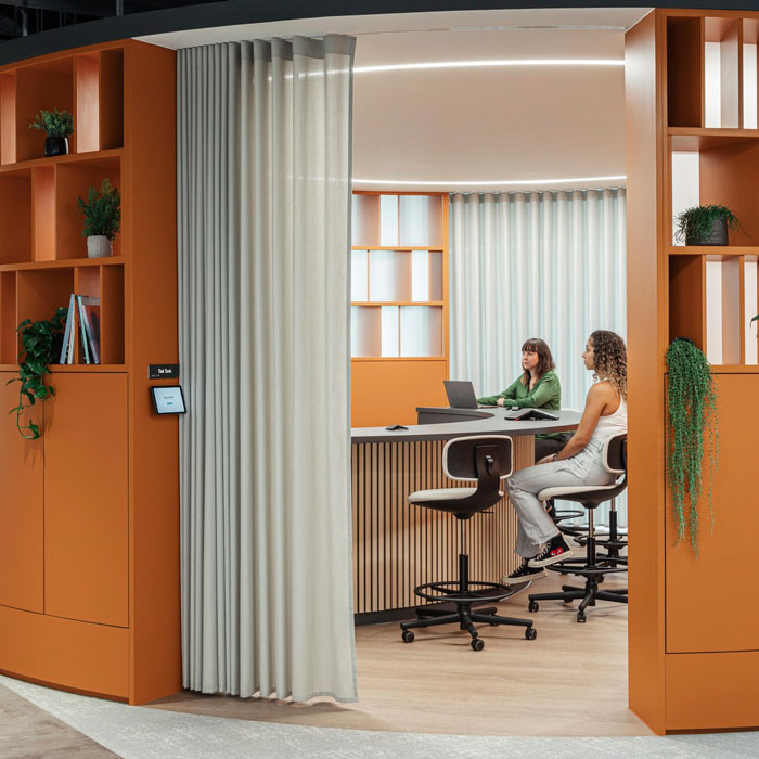 As collaboration can be distracting within an open plan office, M Moser divided the Tink Tank from the main workspace by using curved walls and semi-transparent curtains to avoid disturbance to those working nearby.