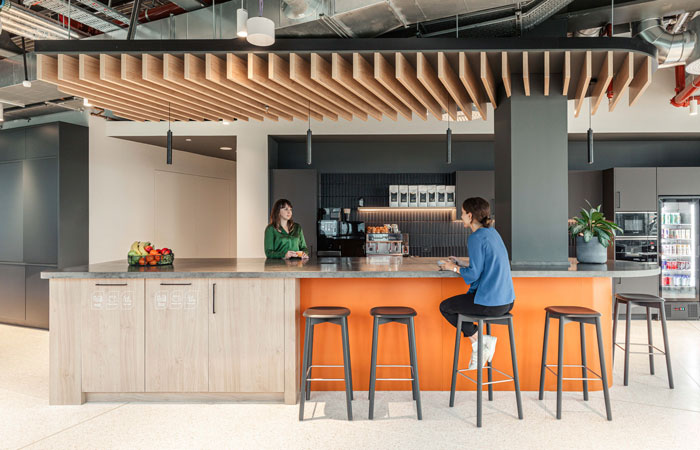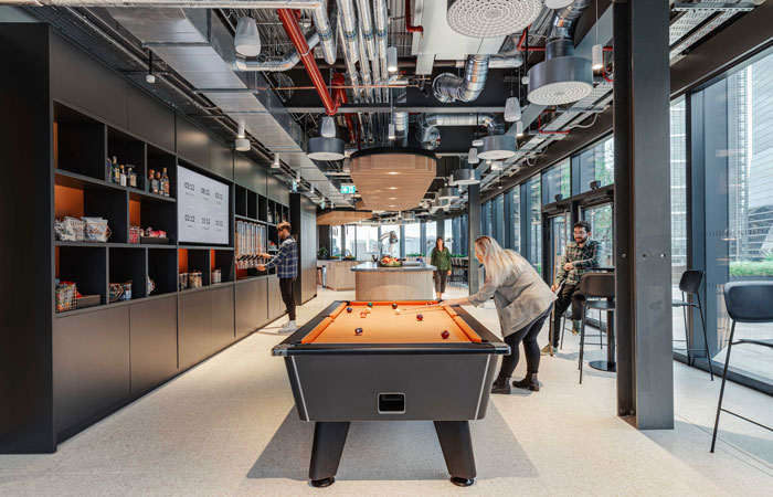 The social café area is designed away from the open plan and offers opportunities to connect. For instance, staff can unwind on the pool table or watch sports in the lounge area after work.