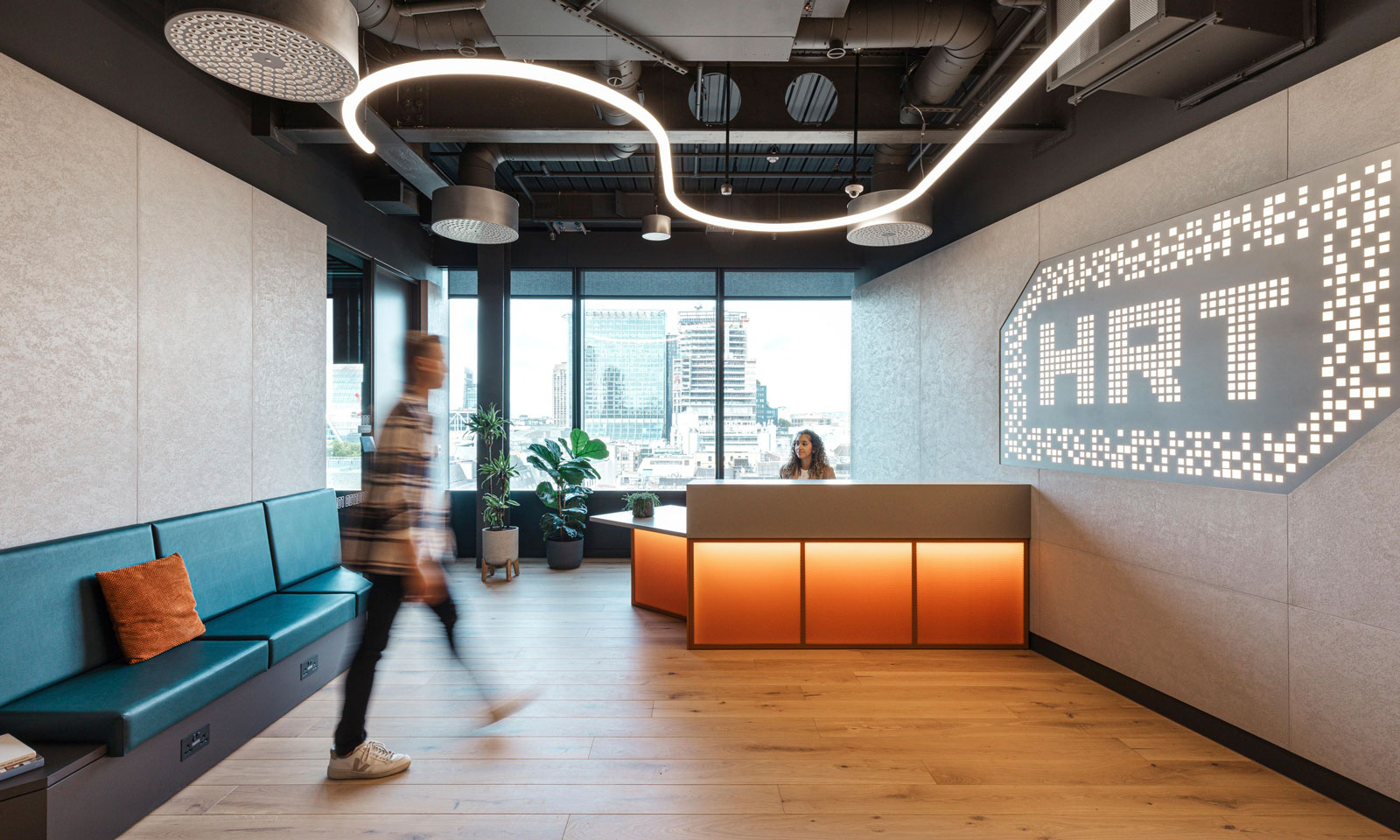 For HRT’s office in London, M Moser kept branding subtle and focused on designing for people. Bespoke algorithm-inspired artwork creates brand recognition as you enter the reception. Throughout the office layout, the firm juxtaposed the angles of HRT’s logo with the curves of the building.