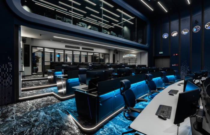 The challenge was to design a mission-critical environment that supports extended control operations while allowing teams to maintain focus and composure under pressure. The result is a 10,000-square-foot workspace that merges futuristic minimalism with mission-grade ergonomics. An environment featuring a disciplined palette of deep blues, blacks, and metallic tones — a visual language that evokes orbital depth while reducing glare. Every design element, from acoustic panels and ambient lighting to carefully selected materials, was chosen to help people think clearly, work comfortably, and perform at their best, even in the most demanding conditions.