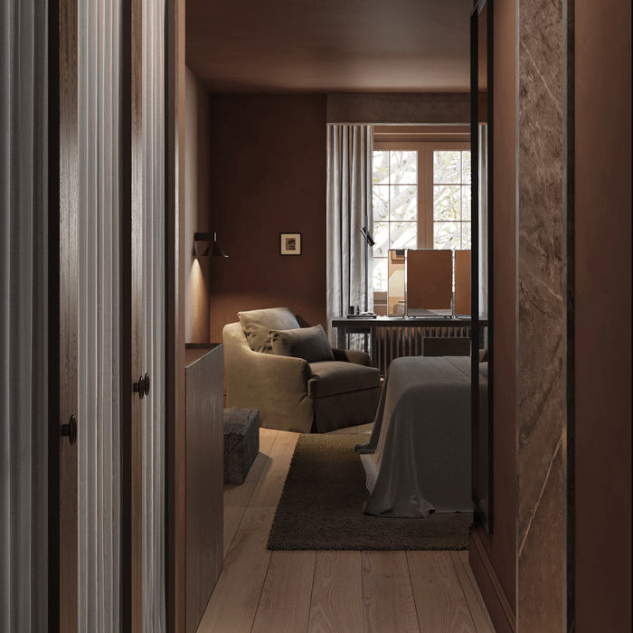 Bathroom entrances are framed with sculptural stone surrounds, marking a deliberate transition into a more immersive, grounding space. This threshold ensures that the bathroom is not just a separate functional area but an integral part of the guest’s experience, reinforcing a sense of flow and spatial harmony.