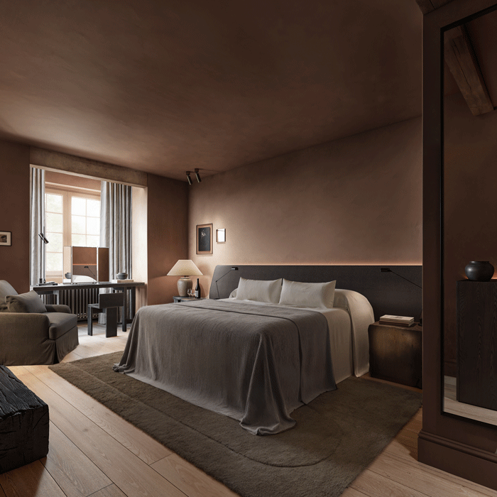 Beyond the private spaces, custom stone plinths, monolithic fireplaces, and hand textured plaster walls define the public areas, creating a refined yet elemental atmosphere. Each bespoke item has been designed to feel like it was already in situ and sculpted from the same philosophy of restraint, presence, and material honesty.