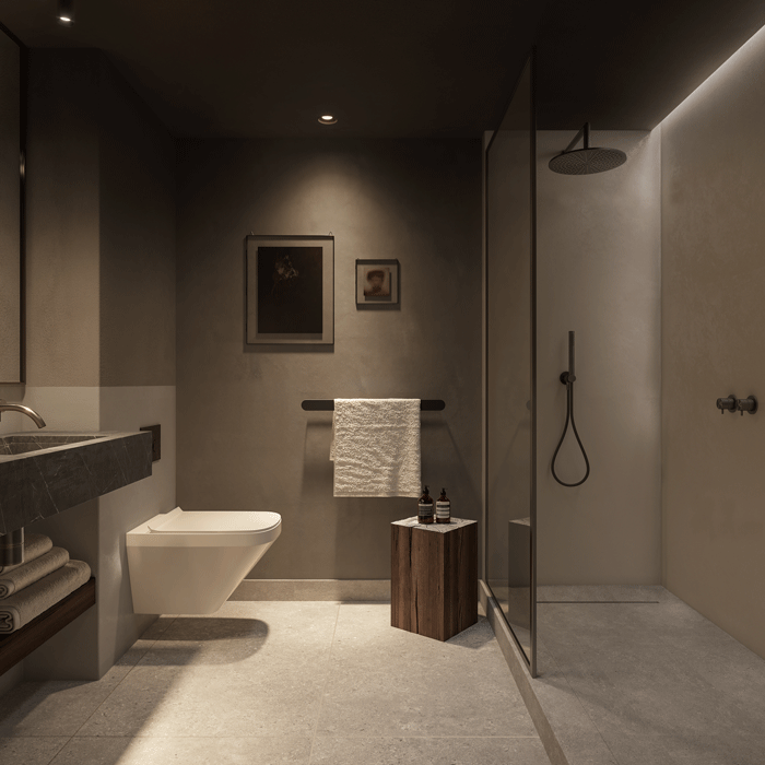 The colour palette draws inspiration from the natural landscape, featuring muted limestone, soft earth tones, deep charcoals, and weathered timber. In the bedrooms, the tones are warm and grounding, aimed to soothe rather than evoke stimulation. Public spaces present a slightly richer contrast with deeper, more textural tones, adding depth and allowing for shadow play throughout the day. This results in effortless cohesion, making the palette intuitive instead of strictly defined.