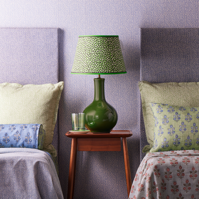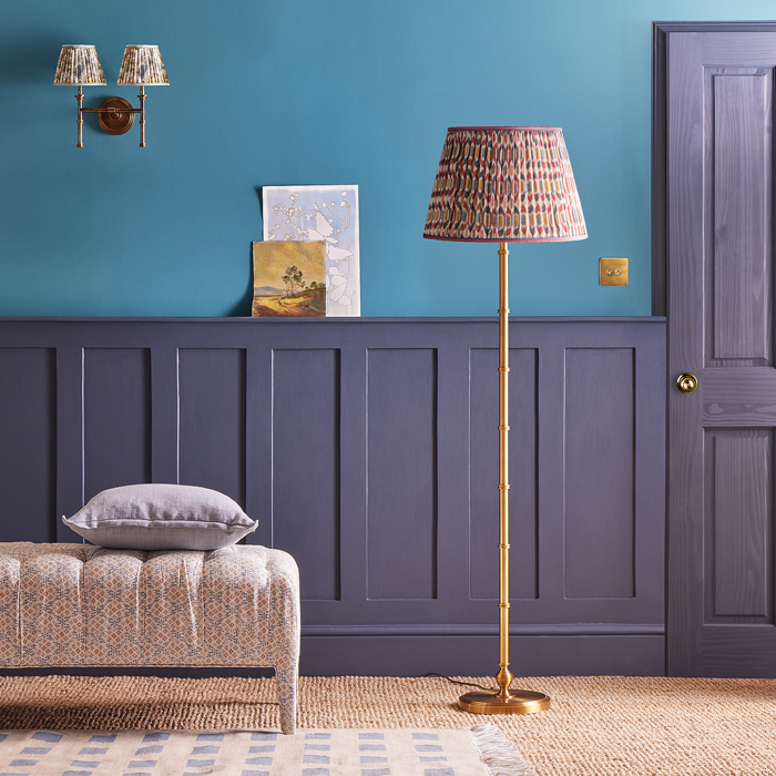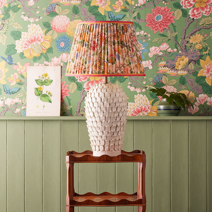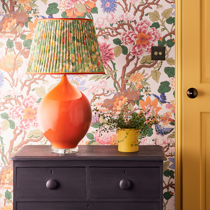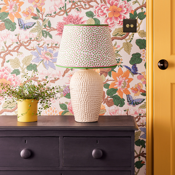 Baker’s enduring designs have been carefully re-coloured and rescaled and include iconic ‘Ferns’ and ‘Magnolia’ originally painted by textile designer William Turner in the early 19th century as well as ‘Small Ikat Spot’ a design based on the much loved ‘Ikat Bokhara’ fabric and ‘Polka Dot’ an enchanting two colour design inspired by a mid-century archive document. ‘Ferns’, ‘Magnolia’ and ‘Small Ikat Spot’ have been beautifully reimagined to a smaller scale and printed onto a linen ground. These pleated shades are trimmed with a bold contrasting edge to create a timeless, statement empire shade perfect for adding punch to any room.
