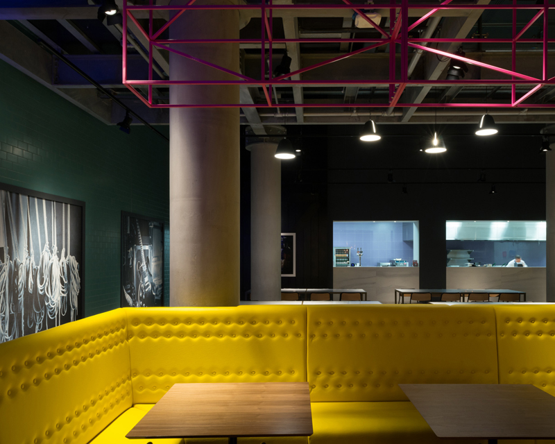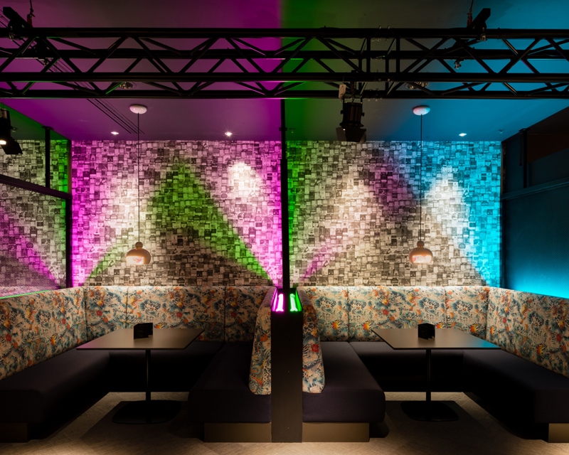 The seating was traditionally manufactured to the client’s exact specifications at Inside Out’s London workshop using FSC certified beech wood for the frames. For the upholstery luxury fabric brands were selected, such as Jean Paul Gaultier and Camira. Each fabric was carefully selected to match the décor inspired by The O2’s iconic musical performances and 1960’s design. The bold colours and patterns are the perfect complement to the bare metalwork and herringbone wooden flooring. To accommodate different visitors’ needs, the seating was designed to create open seating units as well as booths that offer a little more privacy.