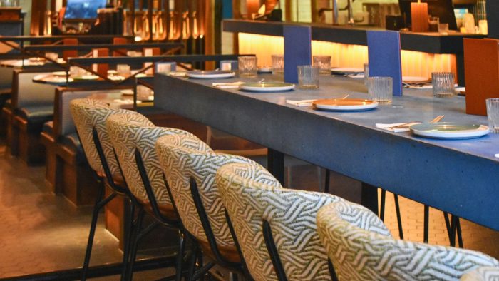 The Alpha side chair and Alpha bar stool, with their bold upholstery and sleek metal frames, create a contemporary yet inviting look. These statement pieces add to the restaurant’s eclectic charm while ensuring durability for high-energy dining settings.