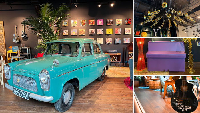 Ruby Zoe has captured this love of music and expresses this passion through various musical instruments. From trumpets hanging from the ceiling, a purple piano, and guitars displayed on the wall or standing alone. There are also a range of vinyl music covers used as artwork in its own right on the walls.