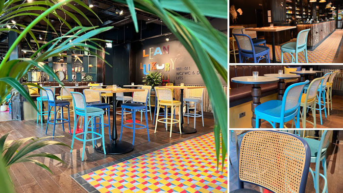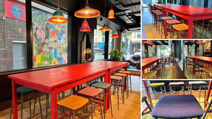 Contemporary and colourful, the Agatha stool with simple metal frame is upholstered in a range of different colours. The venue has windows facing the street with colourful wall art outside. At first glance, the wall art outside looks like a picture chosen to match the interior design.
