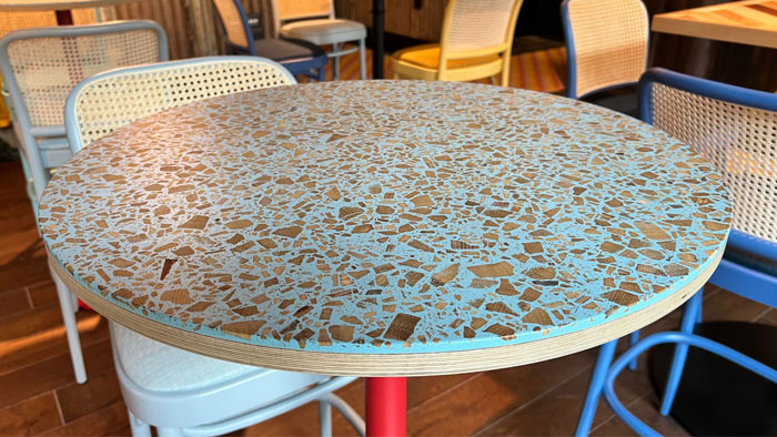 The mixture of patterns and textiles we can see in the table top selection. The contrasting red Ice Cube table base mixes with the blue Terrazzo table top as an example.
