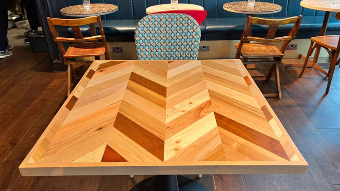 Interesting patterns exist in various items such as floor tiles, chairs, and table tops. This table top stands out because it is crafted from recycled pallet timber and features a chevron pattern and thin border. The reclaimed nature of the wood used ensures each table top produced is unique.
