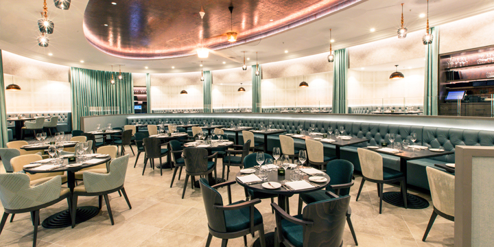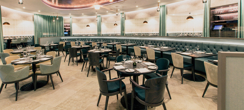 Referencing the original interiors of M, the aptly names Allure collection of Italian-made side and armchairs is used once again throughout the main dining room. Unified in a mixture of soft emerald and mint upholsteries, the chairs are stained in a dark Graphite for a contrasted appeal.
