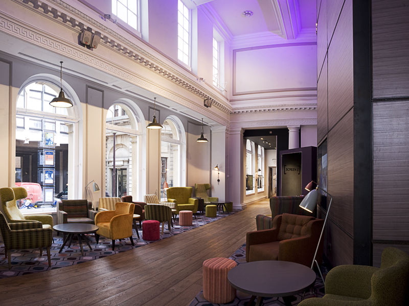 The wood frame for the Lusso armchair was stained to match Havwoods Henley European Oak Timber floor boards, guaranteeing the design had consistency throughout. The playful Marshmallow stool was also incorporated into the refurbishment, upholstered in a range of energetic primary colours. A small selection of our Industrial chairs were included, finished in a striking red, while the stunning modern Tonic Lounge Chair was covered in a harlequin material combining both brights and neutrals. The contrasting range of seats were brought together by The Maggiore table, used throughout the venue and stained with two different finishes.