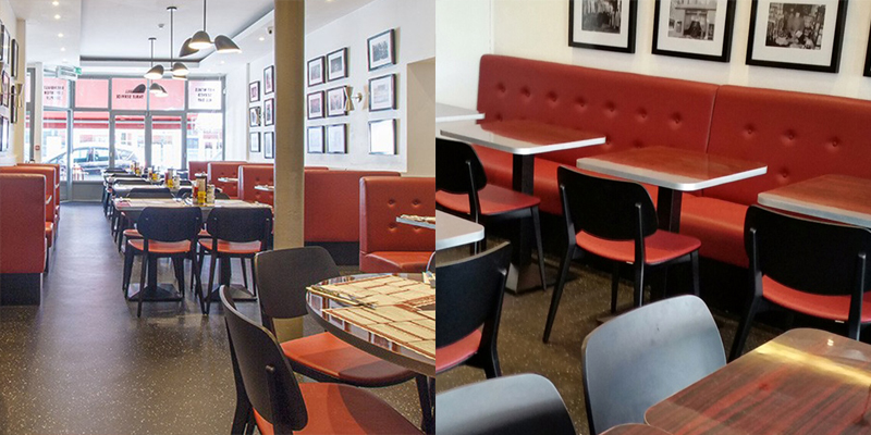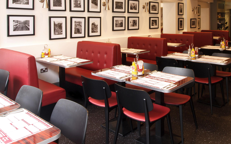 Tables finished in a rosewood laminate and contrast ribbed aluminium edging garnered the design brief for a retro but contemporary feel, whilst bespoke booths and seating in red faux leather carried the new style of the Harry Morgan’s brand.