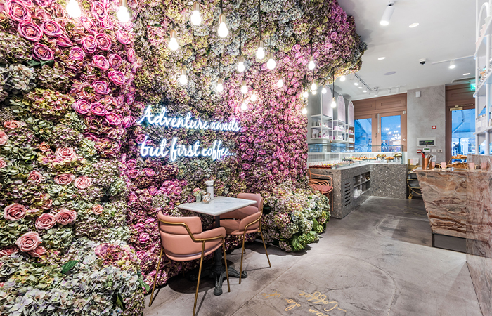 No blooms have been spared in the blushing interiors of EL&N, with flowers in every cascading down the walls and encasing the hanging lighting. Neon shapes and typography peek out from between buds and mirrors help to create pretty illusions.