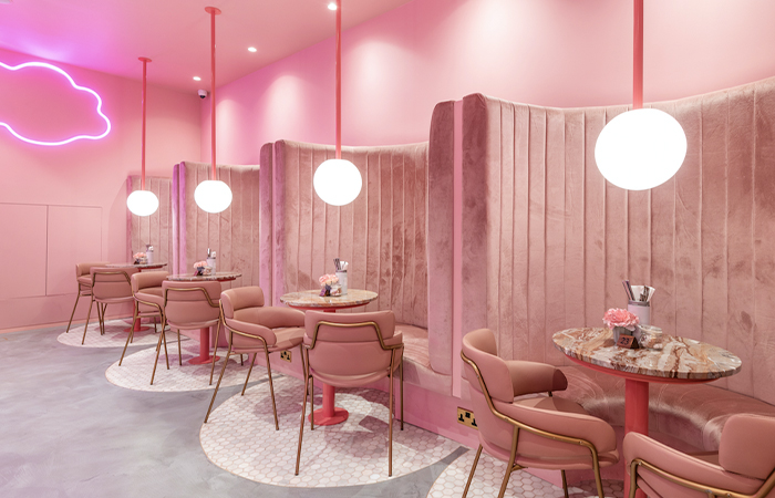 “THINK PINK” shout the Love Hearts that decorate the walls of London’s most Instagrammable patisseries. Collaborating with Holland and Harvey Architects, Inside Out have decorated the EL&N cafes in every shade of pink.