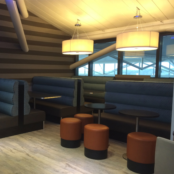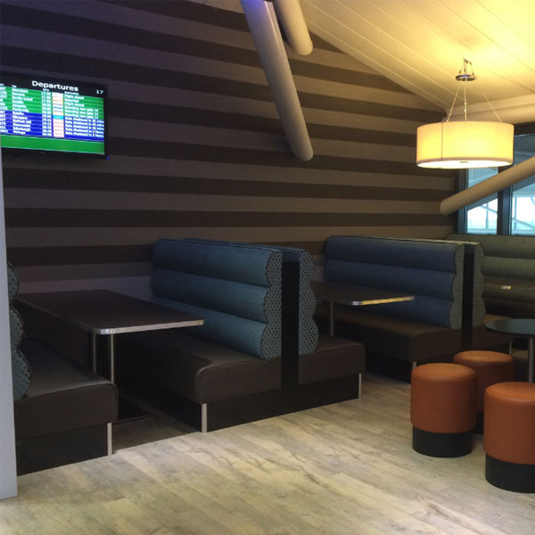 Long American bespoke seating units were used throughout the lounge to zone the space and maximise seating.