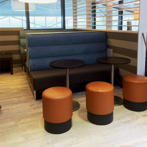 The backs were upholstered in distinctive Sunbury Eco Clam and Gondola, and the seats in Zenith Mocha. This palette complements the booth table tops with their wenge finish and retro ribbed aluminium edging.