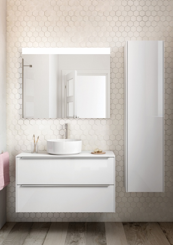 Inspira furniture units, available in 600, 800 and 1000mm dimensions and a choice of finishes – Glossy White, City Oak and City Oak/Dark Glass Mirror – complemented by column units offering great storage and practical uses (internal lighting, adjustable glass) that can all be perfectly combined too. Additional storage is also provided by two fully extracting drawers with no cut-out (required for the basin trap) featuring a compartmentalised interior and a tactile textured finish in dark wood. The furniture units also feature a durable soft-close system that allows a soft and silent closing.