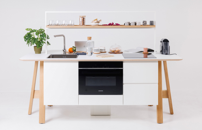 Beautifully handcrafted, the solid oak frame and durable countertop with exposed plywood edge is designed to provide a unique freestanding kitchen space, showcasing the beauty of natural wood. Combining versatility with space-solving design, the Apex features discreet under counter cabinets, a flexible oak storage shelf with inbuilt touch-lamp and high-end appliances by Franke, Siemens and Plados. Available only by specification, all elements of the Apex Kitchen are built to your custom requirements.