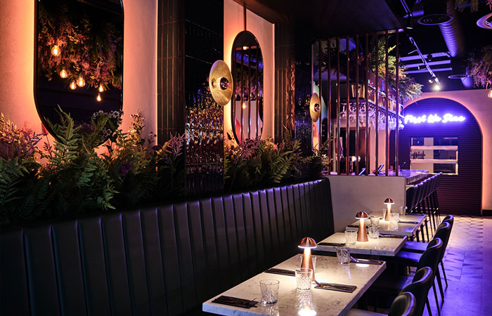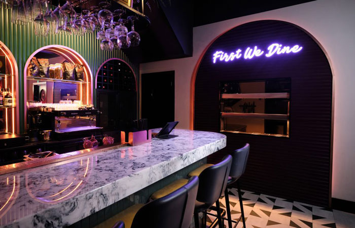Isabel’s oozes modern touches. The custom bright LED slogan ‘First we dine’ illuminates the restaurant in a vibrant shade of blue, whilst using abstract monochrome tiling on the flooring. The creative team at Copper & Ash chose to echo the shape of the door arches throughout the venue with an interesting panelled wall feature.