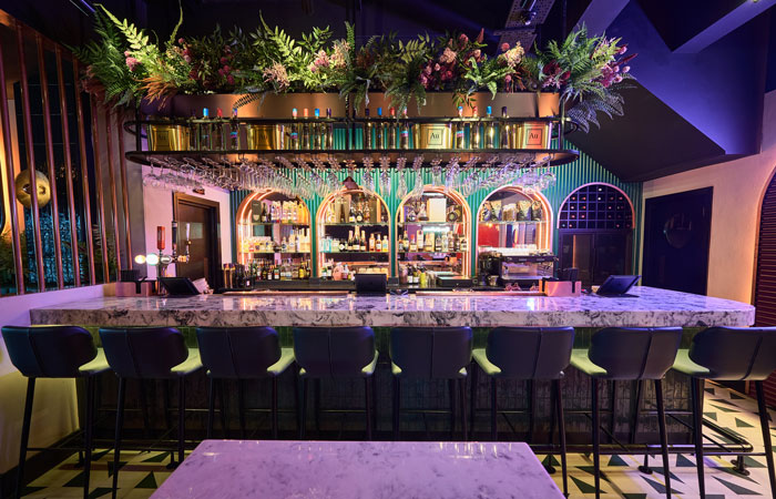 Greenery was also an important element of the overall design, keeping the space fresh. Planting has been used to great effect above the bar, complimenting the pops of green on the wall panels and bar front.