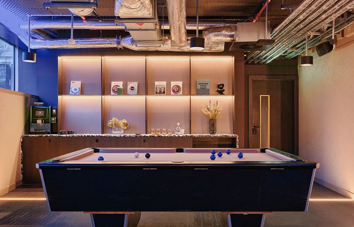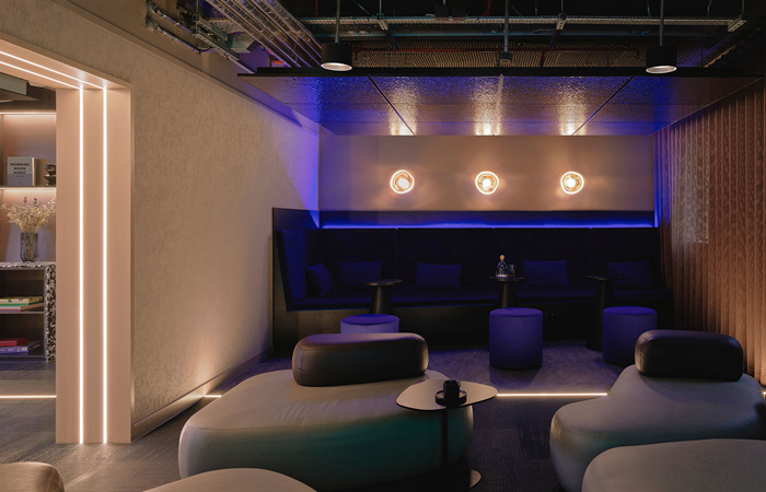 The colour purple features in select areas of the lighting for added ultra-violet drama, including the use of vertical batons, whilst the colour has also been used for specific details, from room numbers to bespoke purple pool balls. The use of the colour means that the scheme delivers a clear sense of place whilst dialling down any overly-literal use of logos or brand collateral.