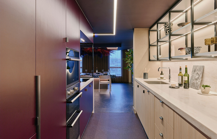 The building, dating from 2017, when it was purchased by the client as a new-build, underwent a comprehensive cladding replacement treatment as part of the remodelling, under the aegis of ADP Architecture, who also space-planned the new internal layout. Jasper Sanders + Partners developed the brand identity and market positioning of the asset, translating into a detailed interior concept for all communal areas – including fitness suite, media room, yoga room, games lounge and communal lounge and dining area – as well as the internal configuration of each individual apartment, most of which necessitated a slightly different and bespoke solution. The individual configurations of the new studios meant a lot of challenging work was needed at the planning stage to create a reduced number of bespoke furniture types, whilst respecting the intent to avoid repetition.