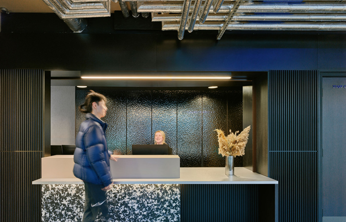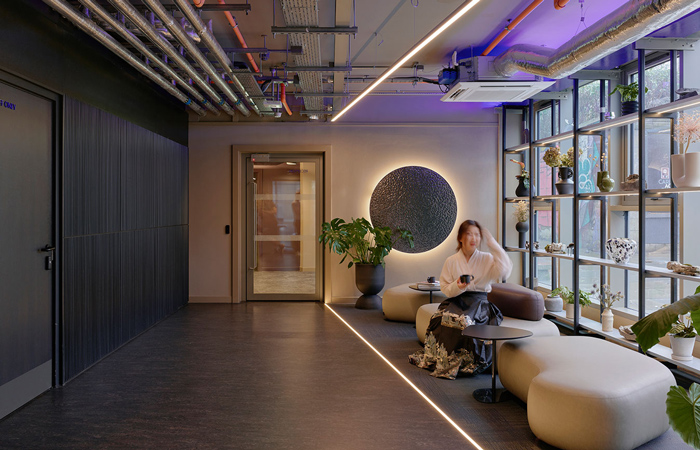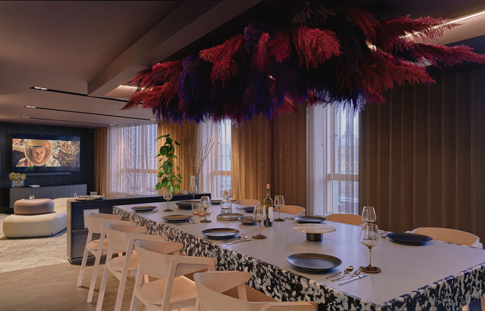 ‘Textures are also a huge part of the materiality of the scheme, and play a significant role in its elevation towards a more premium ambience. Stand-out features include the distressed-metal panels to the rear of the reception desk, as well as the reception desks panelling, finished in Smile Plastics, which features again to the perimeter of the bespoke sixth-floor dining table.’