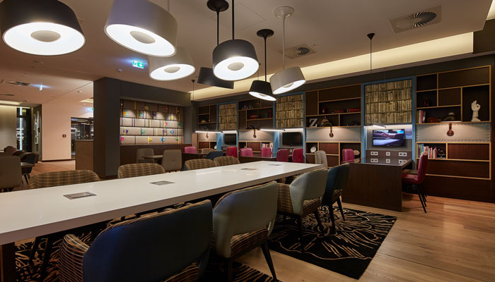 As a contemporary take on a typical British library, the lobby is a multipurpose living space – a welcoming and up-to-the-minute lounge where busy young travellers can unwind, recharge their batteries, and work side-by-side with others. The tables in the cleverly planned work zone incorporate state-of-the-art data technology to support guests as they prepare for meetings or check emails.