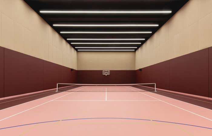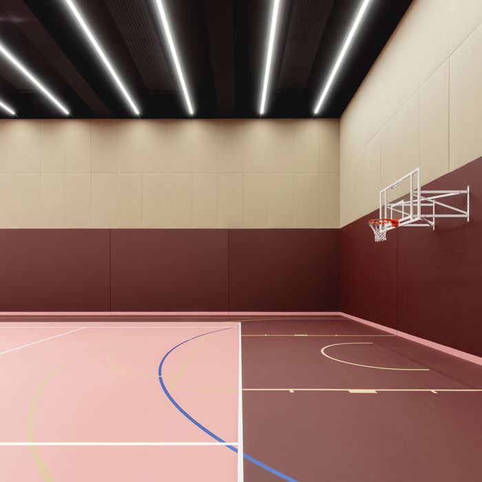 In the Sports Hall at Manchester’s Deansgate Square development, Jolie drew upon their research of the psychological benefits of colour for sporting activities, choosing colours and lighting to immerse people in a space that feels energising, competitive, but also fun and fresh. Deep red was utilised as a powerful and competitive colour, invoking energy and strength, and combined with a bright pink contrast to encourage playful behaviour and provide a sense of comfort.