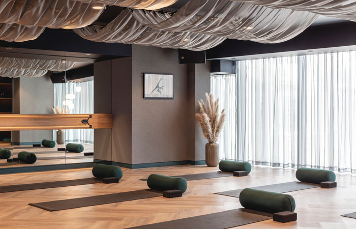 These two dominant colours were balanced with natural hues so as to reduce a fear reaction, typically associated with red, including a bold black ceiling and soft beige used in the acoustic panelling. In the gym, Jolie combined warm oranges and yellows with light pinks; all colours that psychologically spark confidence, energy, productivity and happiness, paired with sustainable wood finishes and dark greys to ground and balance.