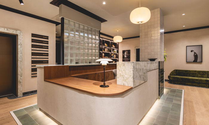 The main entrance has been transformed with sleek modern glass and stealthy black metal frame-work doors, while the facade has been uplifted through cleverly placed lighting and box hedge planting, ensuring a striking street presence both day and night. Throughout the building, textured dark timbers, brass joinery openings, and soulful marble details ensure a seamless transition between spaces. Within the workspace, flexible and comfortable aesthetics take precedence, with soft furnishings, greenery, and residential touches creating a sense of ease and relaxation.