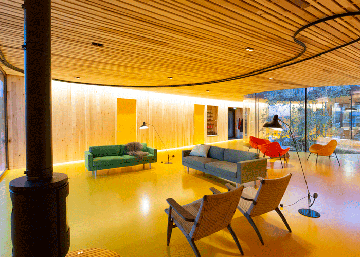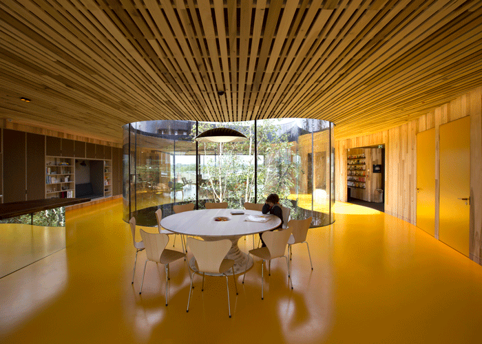 A birch tree grows up through a curved void in the floor and roof. The material palette is warm and deliberate, sunshine yellow resin floors offset against slatted tulipwood ceilings, a walnut kitchen, a great round table where people gather. A curtain by Dutch artist Petra Blaisse loops around one end, creating a room within a room when privacy is needed. Loose furniture is modern without compromising comfort and warmth. A glazed north wall frames a long view out to the Pennines, a horizon, something to look towards.