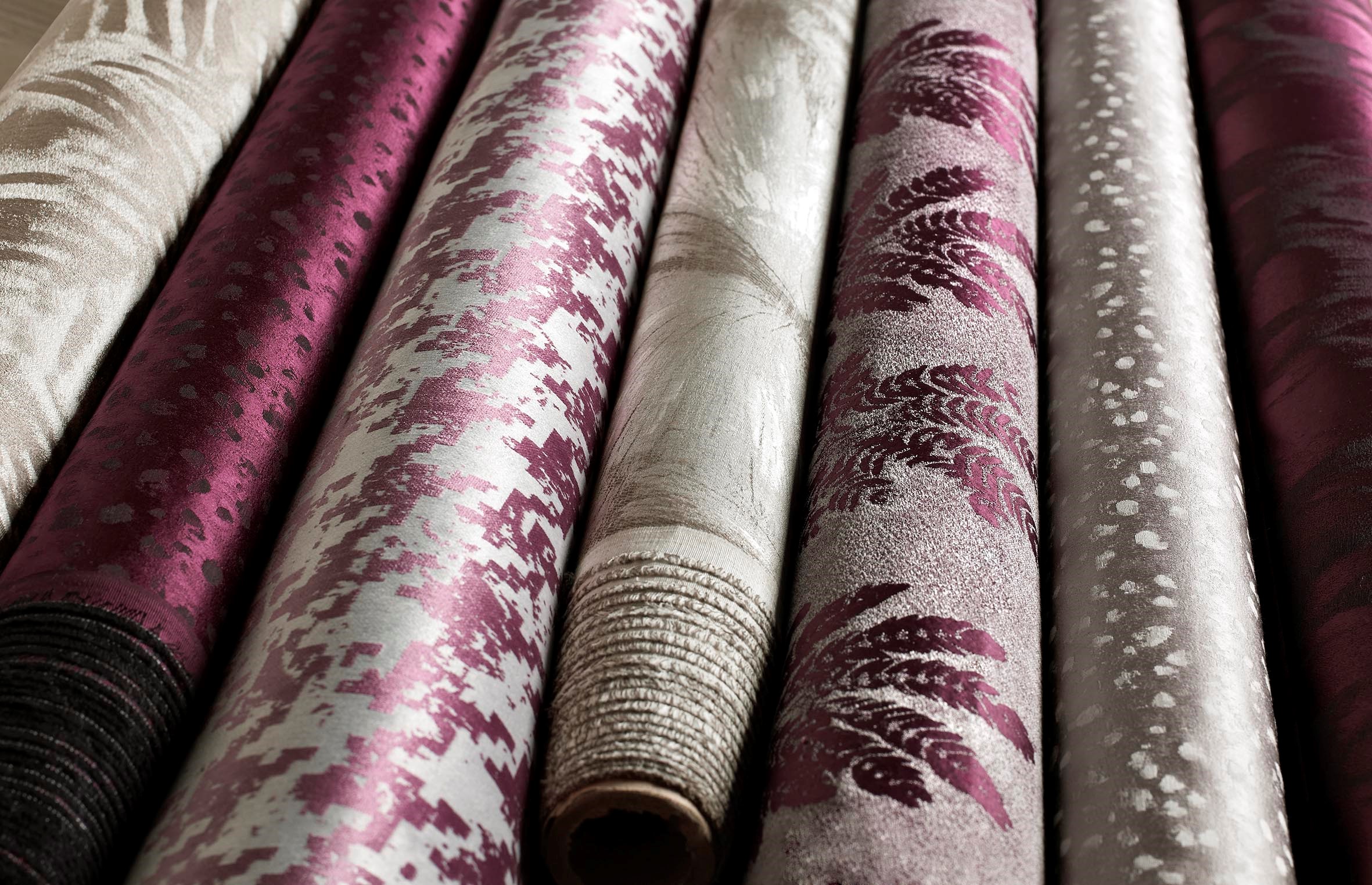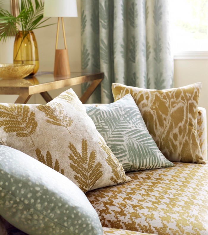 Infused with tones of gold, copper and silver these stunning fabrics encompass a feeling of luxury with subtle elements of distressed textures and natural forms. In a rich palette of Gold and Duck egg, Silver and Indigo, Champagne and Berry, Ebony and Copper.