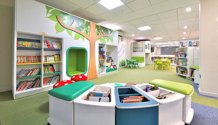 The library caters for over 300 pupils in three different age groups (3-6 years, 7-11 years, and teens), so each area had to have its own character. For the younger years, the space needed to be bright and inviting, while offering an area for quiet and group reading. The teenage area needed to include desks for studying as well as soft and comfortable furniture for more relaxed reading.