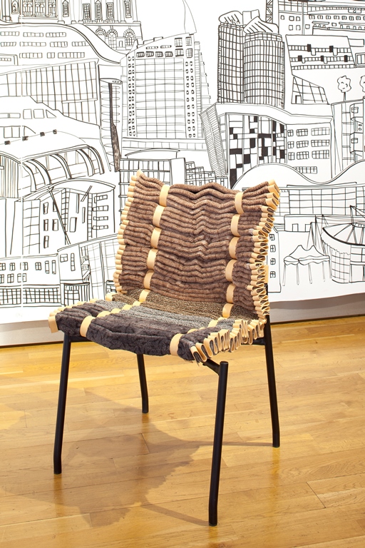Ian Reveley is now in his second year on the MA Art and Design Practice: Furniture Design at Bucks New University. Inspired by an international student competition set by the Belgian carpet industry, Ian designed The Serpentine Chair. Unused samples and off-cuts of carpets which would potentially end up in landfill are transformed into a functional part of a piece of furniture. Inspired by the visualisation of a sound wave formation, he created a structure which allows the carpet to be more than just a covering material.