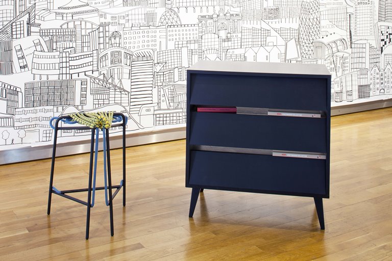 Wesley George is in his second year of a degree in BA (Hons) Furniture at Bucks New University. Through exploration and experimentation with t-section steel he devised his T-Section Chair by inventing a process of bending the steel in on itself creating a lovely unique curved profile, with a portion removed to allow it to bend. His bedside reading table is designed to be a quick depositary for eBook/iPads during a night-time reading session. The folded corner of the drawer eliminates the need to open it. The vibrant red draw front references the iconic Royal Mail post box. The styling is a considered shaker/ modernist mix.