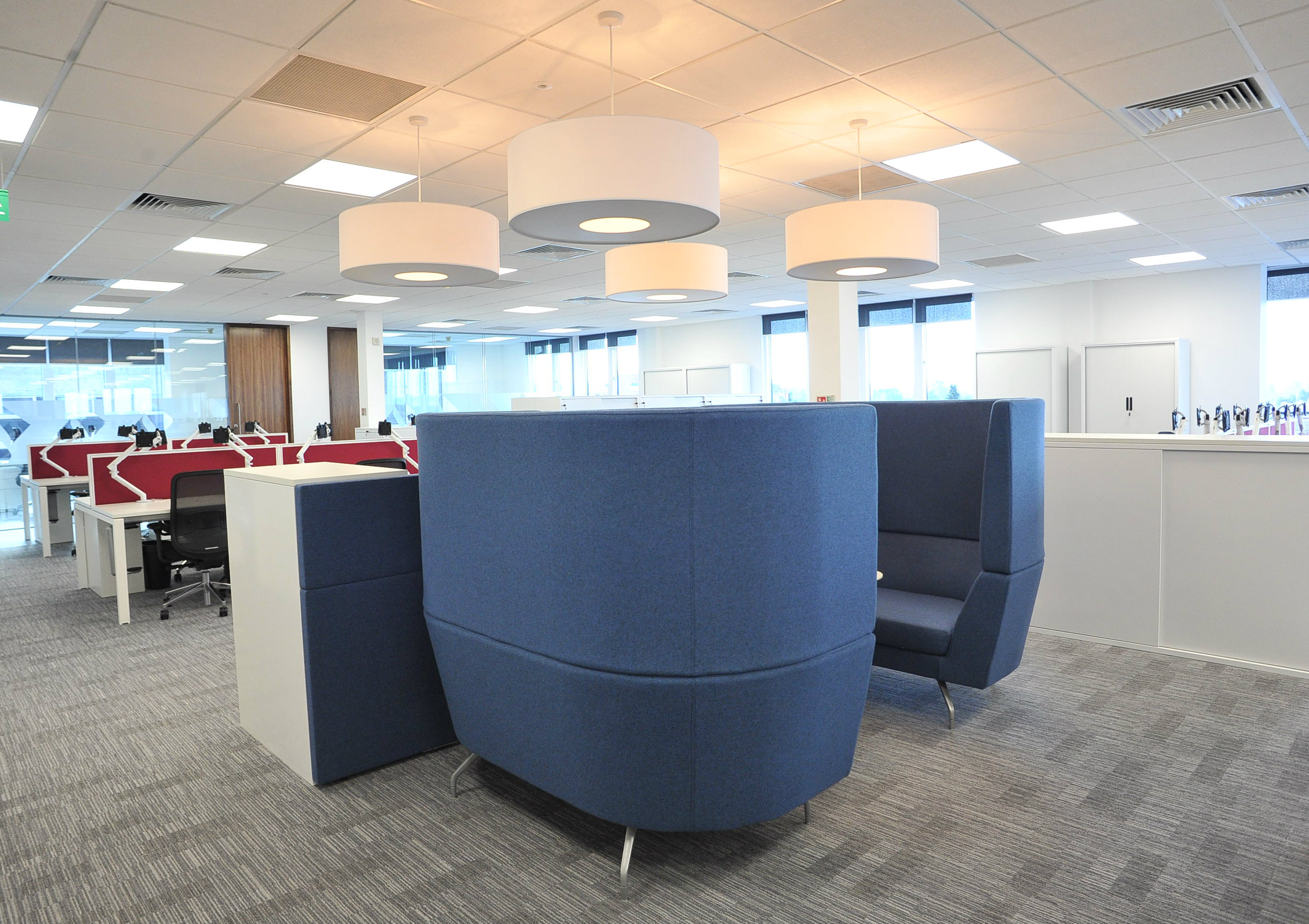 Fuchsia, a colour that is not synonymous with First Title, was selected for workstation screening. This adds vibrancy to the overall colour scheme and enhances privacy throughout the open plan office. KI’s Breakout has been used to integrate third space with printer facilities adjacent to workstations, keeping them accessible within the open plan. In addition to this, the new offices incorporate a number of elements to improve staff wellbeing, many of which had never been considered by the company before this relocation. Ergonomic seating, breakout zones, central and accessible resources, impressive meeting rooms, noise reduction and soundproofing, all come together to achieve an enhanced user experience.