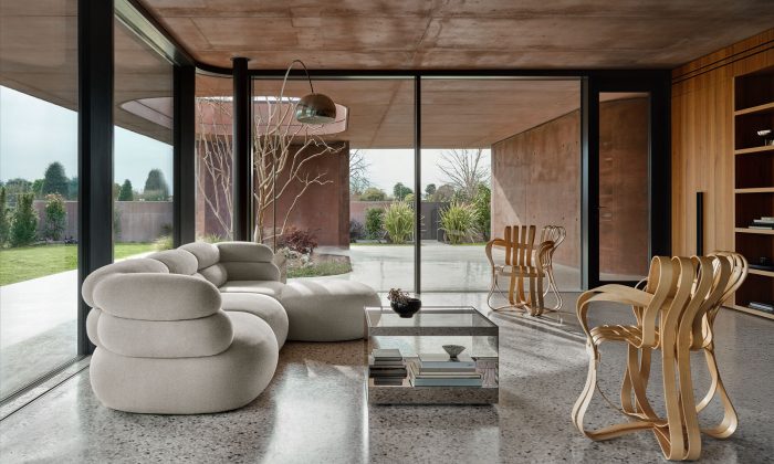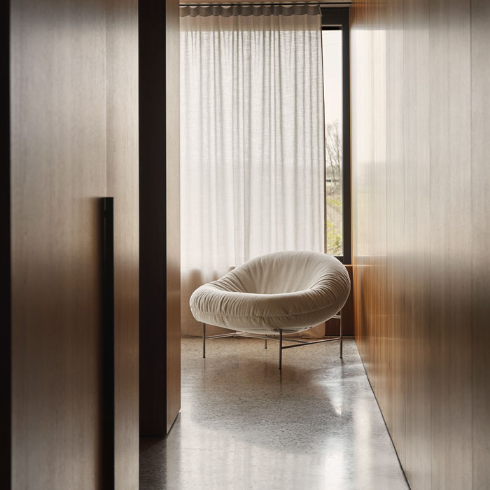 The sculptural form of Biboni echoes the firm’s distinct approach to architecture, shaping space into volumes, voids, and curves. Plush scallops and soft folds are shaped into an anthropomorphic form that envelops and embraces the human body. The experience of Biboni strikes a balance between formal and informal, offering a unique combination of softness and support, allowing the sitter to feel both relaxed yet engaged at once.