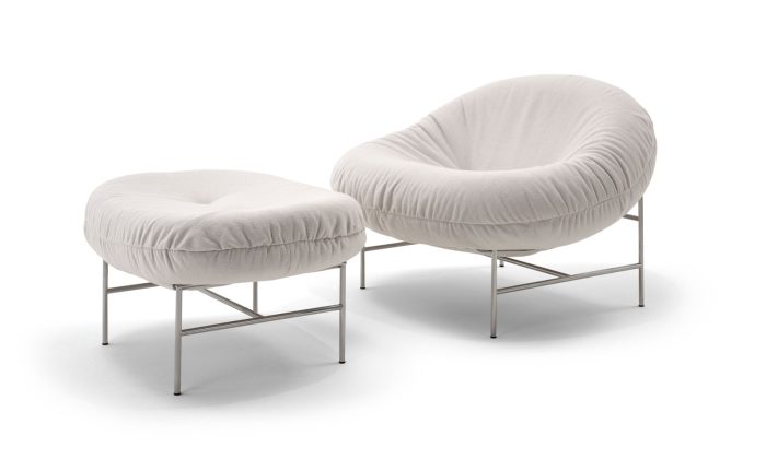 With a thick cushion supported by a slim frame, the Perron Bun Lounge Chair plays with the juxtaposition of heavy and light. Like an inviting nest, the pleasing roundness of the mattress-like cushion is visually and physically comfortable. The curves of the sling base hold the sitter in a comfortable, reclined position, while the discreet stilt legs virtually disappear to make the cloud-like seat appear to float in space. It is available with or without an ottoman.