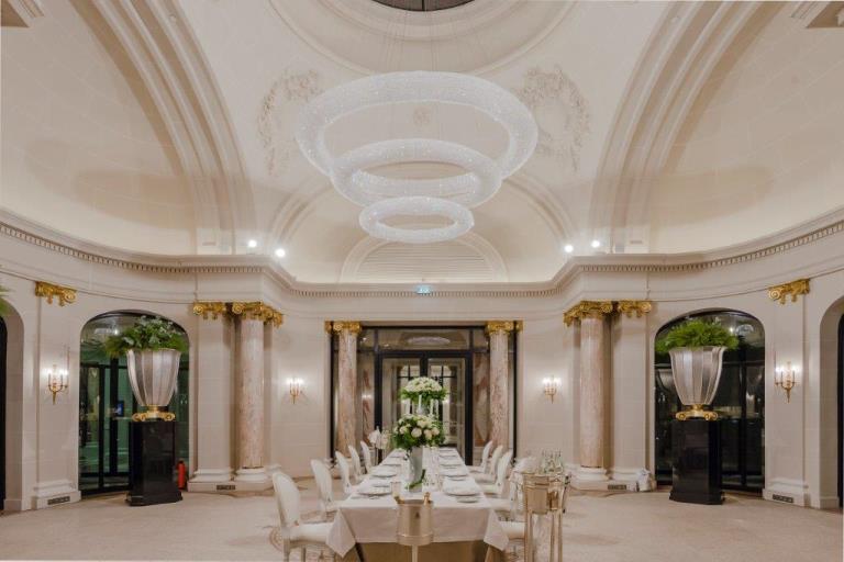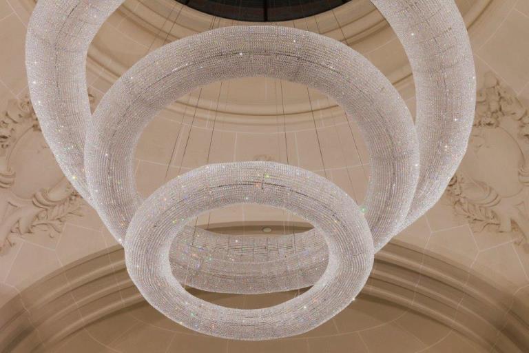 The oval shape of the sculpture comes from the shape of a necklace hanging from a woman’s neck decorating her décolletage. It resembles Baroque classicist architecture since the rotunda has rounded lines and decorated stucco and cornices which place the jewel directly under the cupola in a central position. This unique, feminine and elegant sculpture is made from stainless steel, Perspex and polished crystal, and is comprised of 90,000 pearls which are externally illuminated. The item is suspended from one central point. The conditions of the historic interior made it impossible drill into either the vaulted roof or the side walls, therefore making it quite a technical challenge for the Lasvit team.