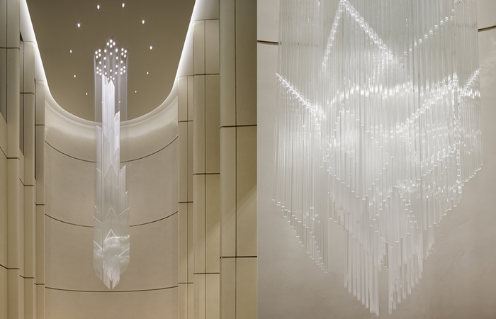 The lighting installation created for this exceptional building by Lasvit in-house designer Ludmila Žilkova, and in collaboration with Foster and Partners, is inspired by the geometry of circles arranged in a six-fold, hexagonal symmetry.