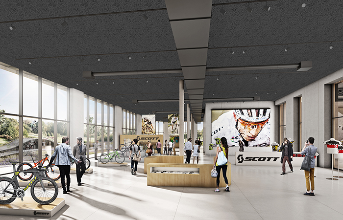 The new Head Office of Scott Sports, located in Givisiez, south-west of Berne, meets all requirements imposed by the modern working world: Here, private life, office atmosphere and public areas all blend together. The sports equipment manufacturer stands for technical innovations in the areas of skiing, motocross and cycling. Cycling to work in the morning, exercising during the lunch break and taking a shower afterwards is common practice among the company staff. Due to its global success, the company’s new headquarters will attract many visitors to see the showroom with a view of the pump track, where the newly developed Scott bikes are tested.