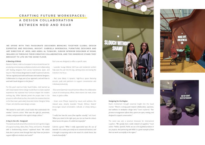 Gabriela Skrobacka, Furniture Designer and Art Director at .mdd, and Aseel Al Tuwairjri, Junior Interior Designer at Roar, discussed their collaboration on an immersive stand experience that explored the emotional and functional stages of a modern workday. Their project highlighted the value of global and regional partnerships in shaping future workplaces.