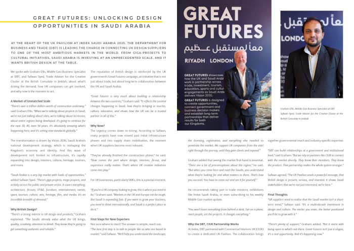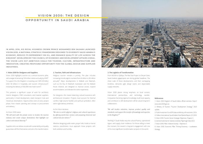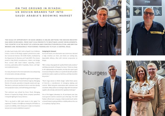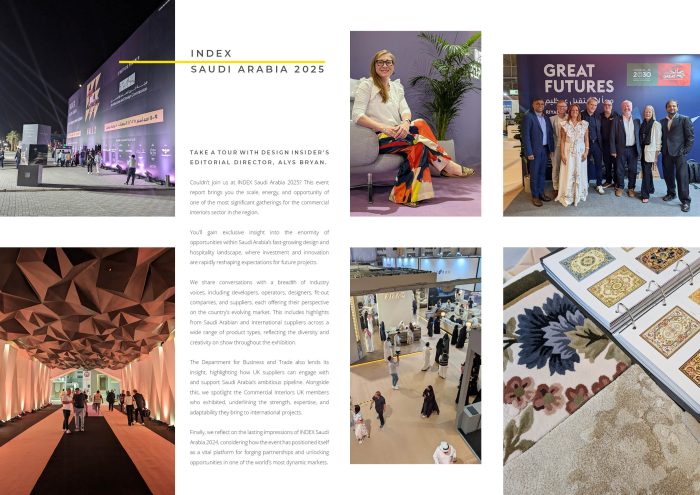 The report explores the scale, energy, and enormity of opportunity in Saudi Arabia, a market where investment and innovation are rapidly reshaping the design and hospitality landscape. Through exclusive interviews, on-the-ground observations, and supplier spotlights, we uncover the real potential for UK and international businesses looking to engage with this dynamic region.