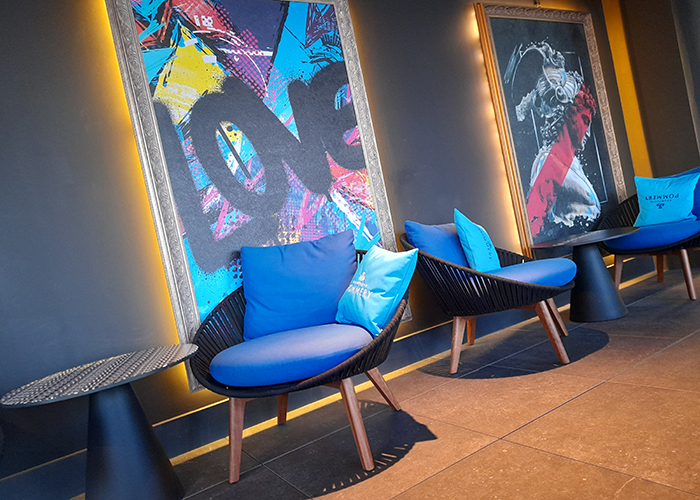 There is a variety of seating, and if you are sitting close to the dramatic wall art, you will be sitting on a black Miray chair with either vibrant blue or yellow cushions, this striking chair offers both style and comfort. The essential lines of the frame combined with simplicity of the materials, the feel of the upholstery and the stylish hand woven look is a true art form of a combination.
