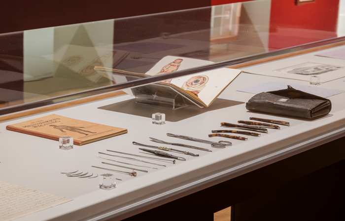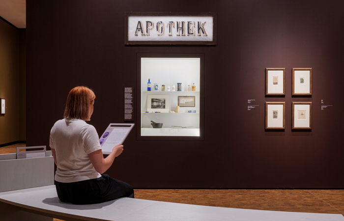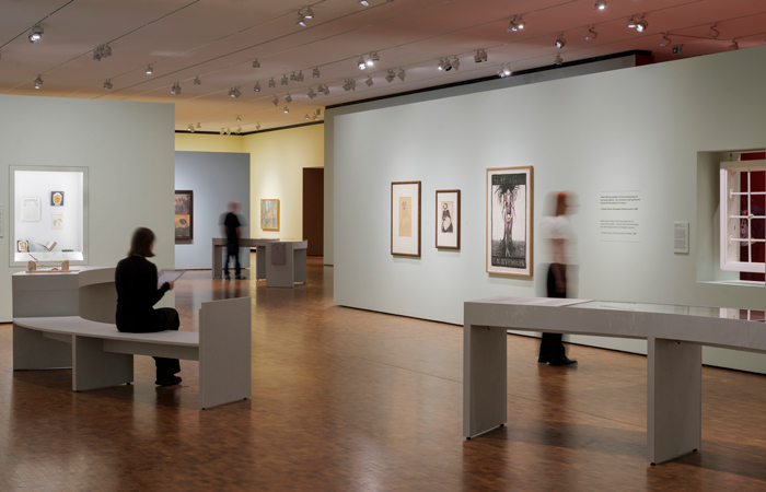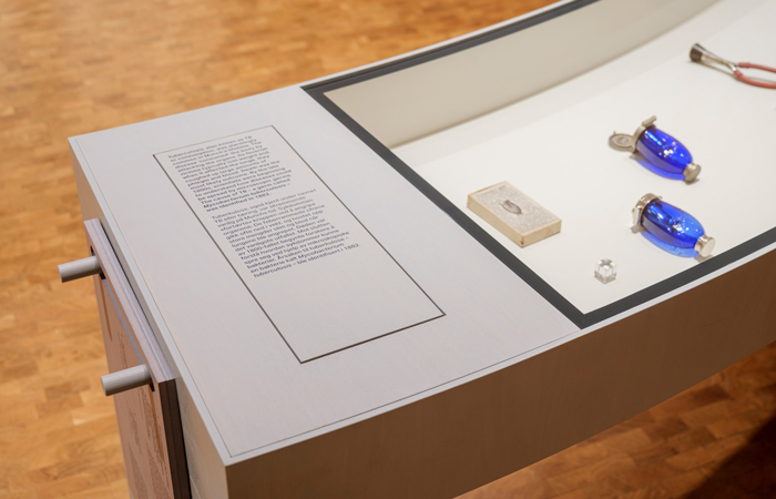 The exhibition took accessibility into account at all stages, with specific approaches including freestanding vitrines, so that wheelchair users can sit easily beneath and look down at the content as well as turning room for all wheelchair-users between showcases. There is also a range of different heights of seating throughout. Eye levels were considered from an inclusivity standpoint for all paintings and exhibits, as well as for wall-mounted vitrine objects, as were font sizes for the hierarchy of information on all panels and labels.